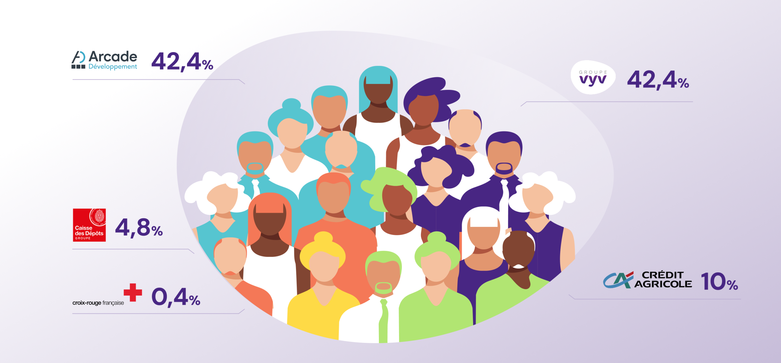 Arcade Développement et le Groupe VYV co-gouvernent le groupe. La Croix-Rouge française, le Crédit Agricole et la Caisse des Dépôts et Consignations viennent conforter ce dispositif actionnarial unique, qui unit des acteurs majeurs du logement, de la santé, de l’Économie Sociale et Solidaire, et laisse une place majeure à son actionnariat salarié.